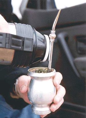 當地人傳統的喝茶方式很特別。一家人或是一堆朋友圍坐在一起,一隻「庫亞」裏插一根「泵吧」,在座的人一個挨一個地傳著吸茶,邊吸邊聊。壺裏的水吸幹了,再續上熱開水接著吸,一直吸到聚會散了為止。這種喝法的確不太衛生,據說全球發「H1N1」流感時,人們懷疑阿根廷人「H1N1」流感的流行與這種喝茶習慣有關。但阿根廷人似乎並不怕這些,照樣輪著喝瑪黛茶。他們認為,瑪黛茶泡好後倒在茶杯裏喝,顯然更符合現代人的衛生觀念,但那樣喝瑪黛茶,就失去了阿根廷風味。喝瑪黛茶,阿根廷人到了不怕死的地步。可見,瑪黛茶對阿根廷人來說有多麼重要。